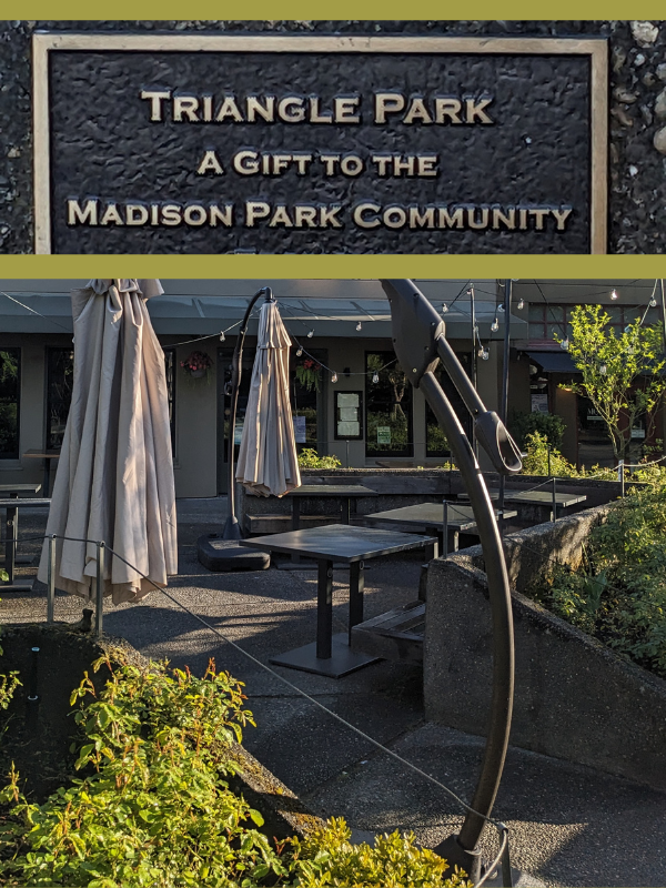 The community also heard from the group Save Triangle Park (https://www.savetrianglepark.com/) regarding the park at 42nd and E Madison St. The small public plaza has been a community gathering center for decades and was originally gifted to the Madison Park Community by private donors. During and after COVID some dining shelters were built in the park by How To Cook a Wolf and the area is used for lunch and evening dining. The family that originally gifted the park spoke about the concern that the permanent structure unfairly inhibits the public use of the park. SDOT is accepting comments from the public through August 13, 2024. You can email the city at publicspace@seattle.gov and make sure to reference permit SUPSM0008488.