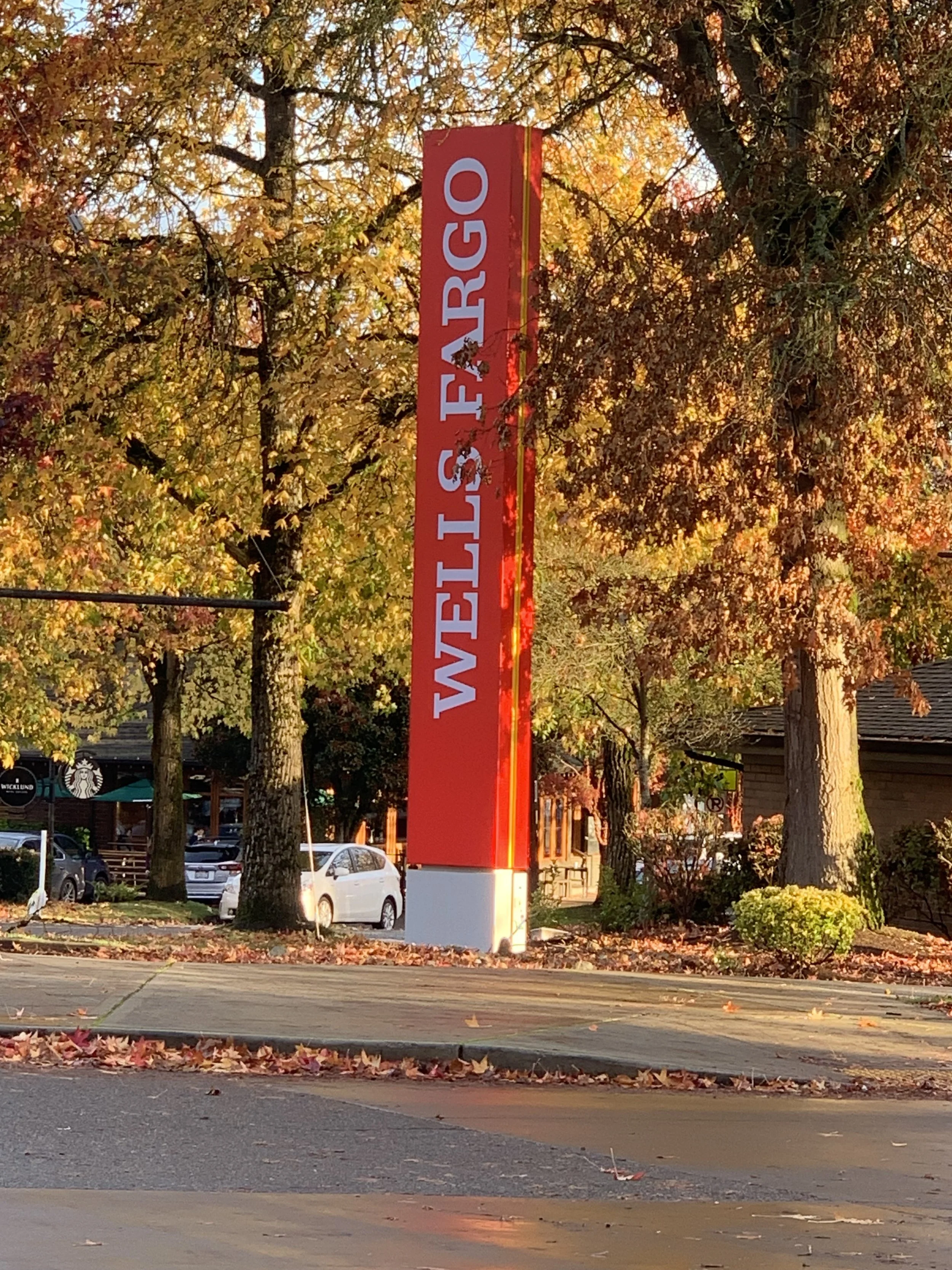 In the past two weeks you may have awoken to see a TALL, red vertical sign at Wells Fargo bank as you enter Madison Park. A bit hard to miss.