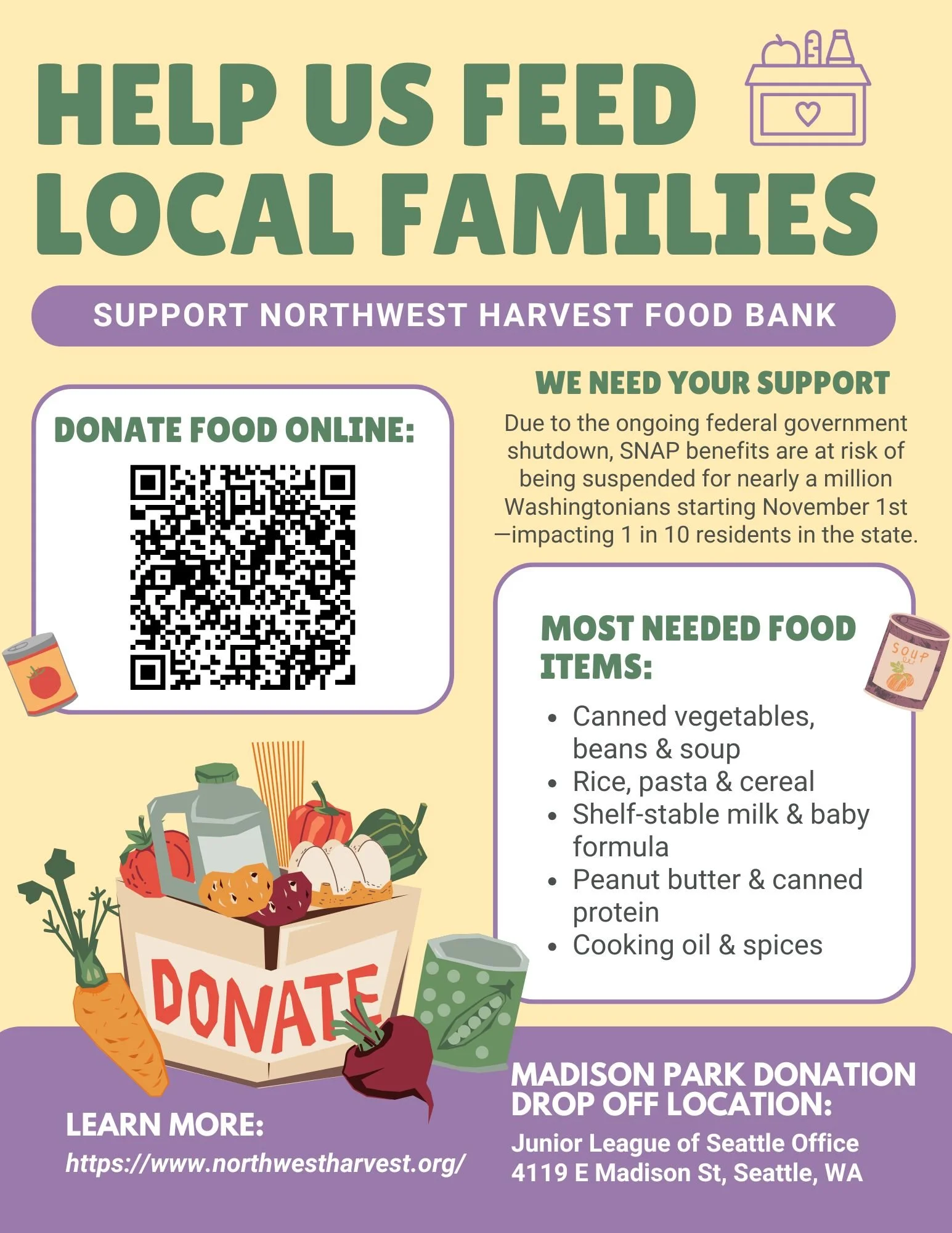 The Junior League of Seattle, our Madison Park neighbor and great supporter, is hosting a food drive for Northwest Harvest, and the need is more urgent than ever. Please join in! Details below.